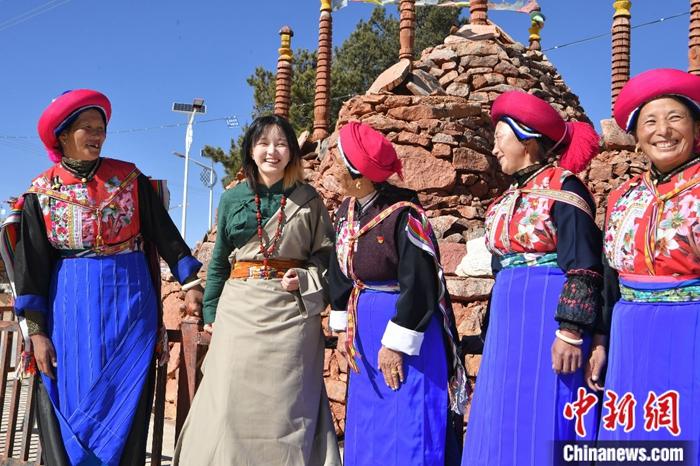 圖為穿上藏裝的格桑卓瑪(左二)在村里與長(zhǎng)輩們聊天。中新社記者 劉冉陽 攝