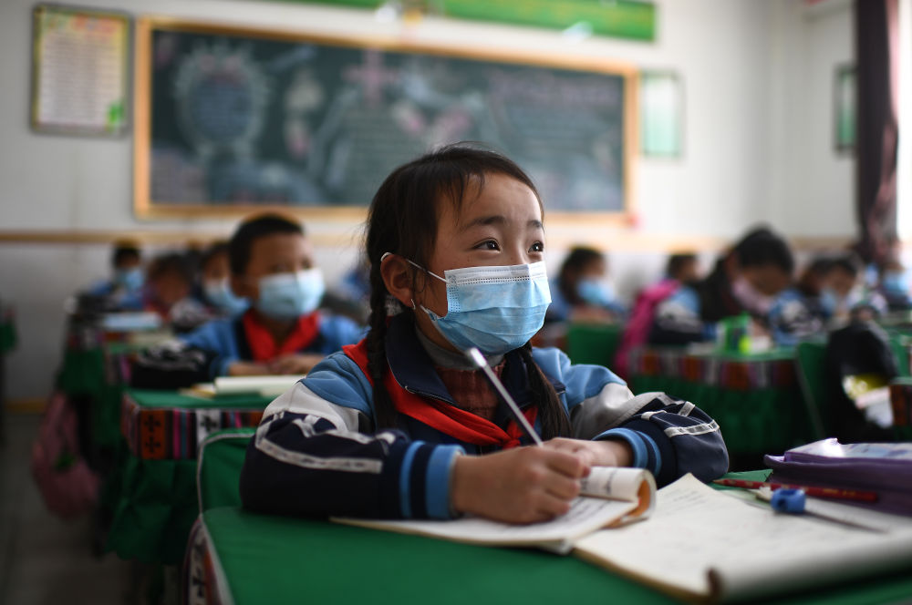 玉樹(shù)市第三完全小學(xué)二年級(jí)一班學(xué)生求永藏嘎在上課(2020年4月9日攝)。