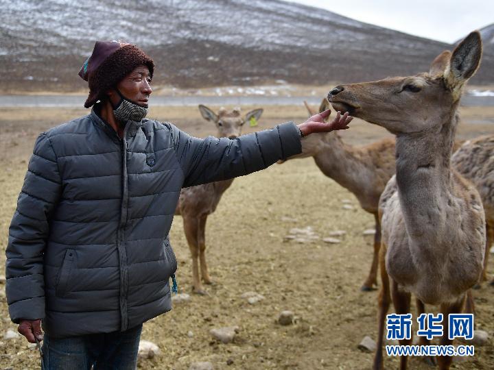 3月13日,甘德縣崗龍鄉(xiāng)恰不將村生態(tài)畜牧業(yè)專業(yè)合作社村民在鹿場喂鹿。新華社記者 張龍 攝