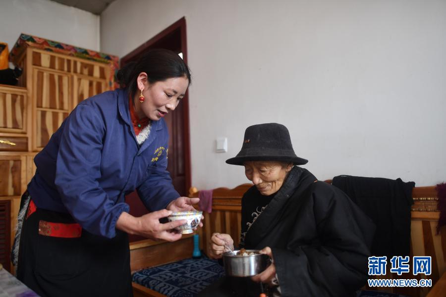 3月14日,幸福敬老院護(hù)工尼瑪卓瑪(左)為只沙群忠送餐。新華社記者 張宏祥 攝