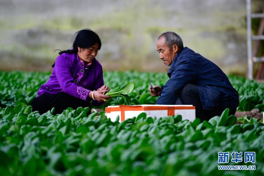 3月14日,在青海省果洛藏族自治州農牧業(yè)生態(tài)科技示范園內,菜農李華軍(右)與尼瑪措毛在采摘蔬菜。新華社記者 張龍 攝