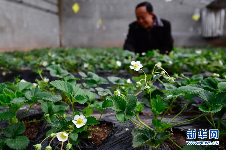 3月14日,在青海省果洛藏族自治州農牧業(yè)生態(tài)科技示范園內,農業(yè)技術員宋建東在查看草莓生長情況。新華社記者 張龍 攝