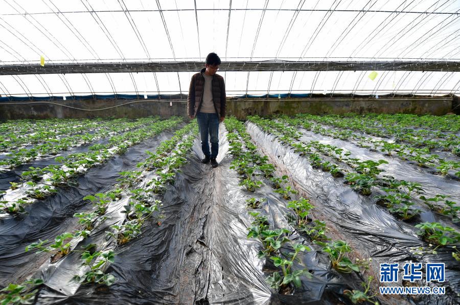 3月14日,在青海省果洛藏族自治州農牧業(yè)生態(tài)科技示范園內,菜農王輝軍在查看草莓生長情況。新華社記者 張龍 攝
