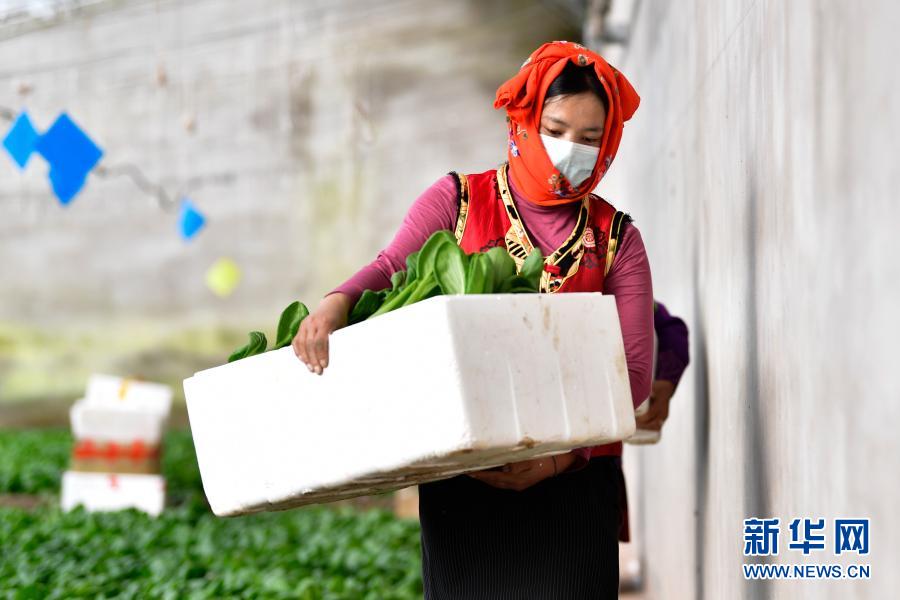 3月14日,在青海省果洛藏族自治州農牧業(yè)生態(tài)科技示范園內,菜農桑吉卓瑪在搬運蔬菜。新華社記者 張龍 攝