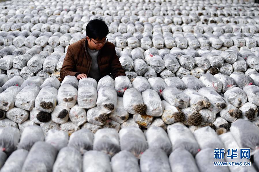 3月14日,在青海省果洛藏族自治州農牧業(yè)生態(tài)科技示范園內,農業(yè)技術員宋建東在查看平菇生長情況。新華社記者 張龍 攝