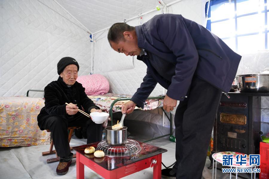 3月16日,在舟曲縣果耶鎮(zhèn)磨里村、果耶村滑坡災(zāi)害應(yīng)急避險臨時安置點,受災(zāi)群眾在帳篷內(nèi)吃飯。新華社記者 范培珅 攝