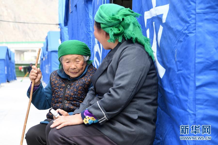 3月16日,在舟曲縣果耶鎮(zhèn)磨里村、果耶村滑坡災(zāi)害應(yīng)急避險臨時安置點,受災(zāi)群眾在帳篷外聊天。新華社記者 范培珅 攝