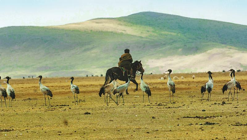 3月6日,今年的第一批黑頸鶴比往年提早了半個(gè)月飛回若爾蓋濕地,大草原上呈現(xiàn)出人與珍稀鳥(niǎo)類(lèi)和諧共處的溫馨畫(huà)面。尹鋼 攝