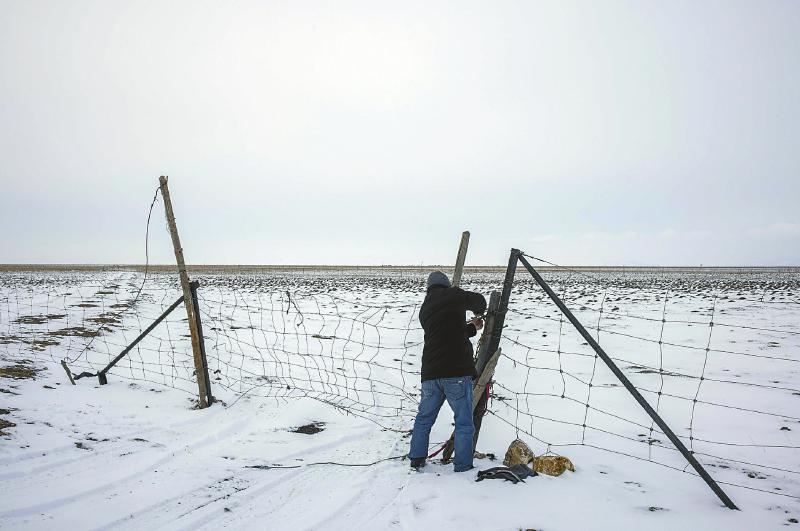 3月6日,若爾蓋濕地國(guó)家級(jí)自然保護(hù)區(qū)管理局生態(tài)護(hù)濕員如科冒雪清理?xiàng)⒌刂苓叺碾[患。尹鋼 攝