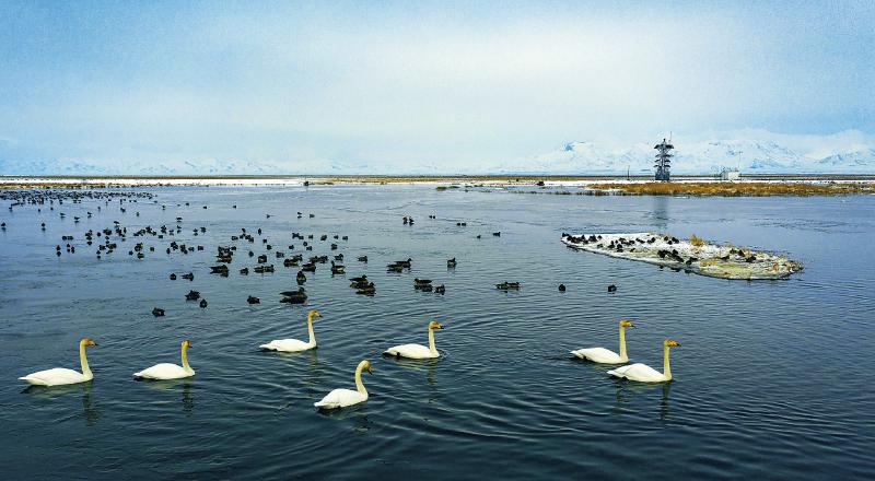 3月6日,若爾蓋濕地國(guó)家級(jí)自然保護(hù)區(qū)在花湖設(shè)立的高科技無(wú)人觀測(cè)塔(右后)正全天候觀察濕地鳥(niǎo)類(lèi)的活動(dòng)。尹鋼 攝