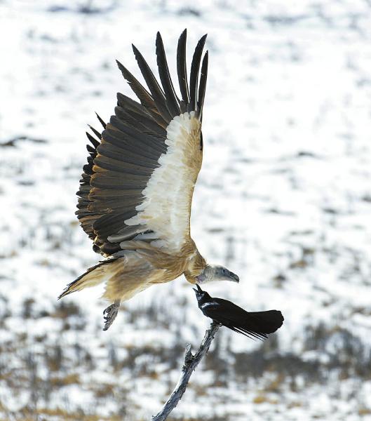 3月9日,在麥溪鄉(xiāng)濕地,一只草原烏鴉和一只高山兀鷲爭(zhēng)斗。尹鋼 攝