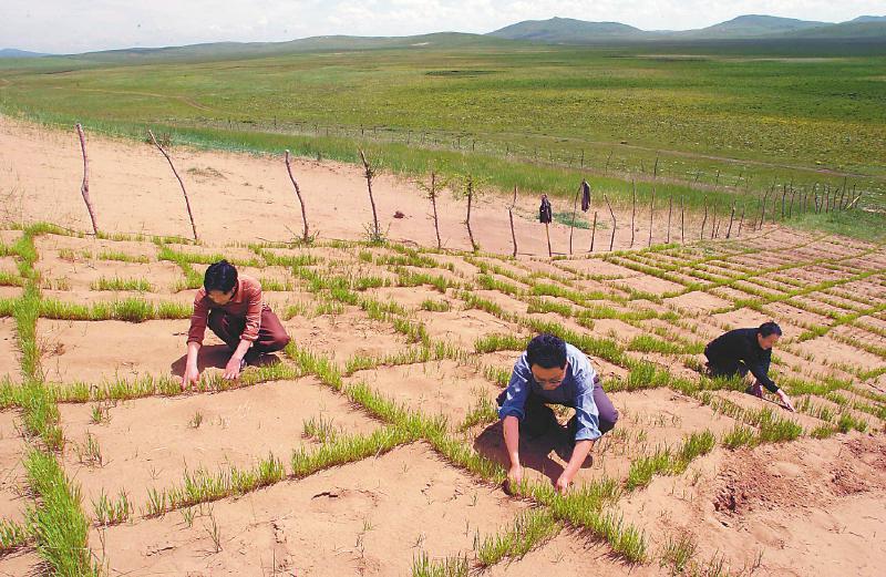 2007年4月8日,當(dāng)?shù)厝罕娫谌魻柹w縣麥溪鄉(xiāng)和轄曼鎮(zhèn)實(shí)施防沙治沙項(xiàng)目。尹鋼 攝
