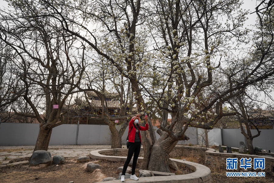 一名游客在梨花樹下拍照。新華網(wǎng) 潘彬彬 攝
