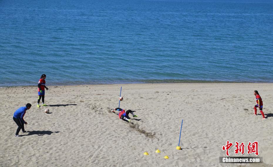青海湖民族寄宿制學(xué)校女子足球隊的隊員們在青海湖畔沙灘上進行訓(xùn)練。中新社記者 馬銘言 攝