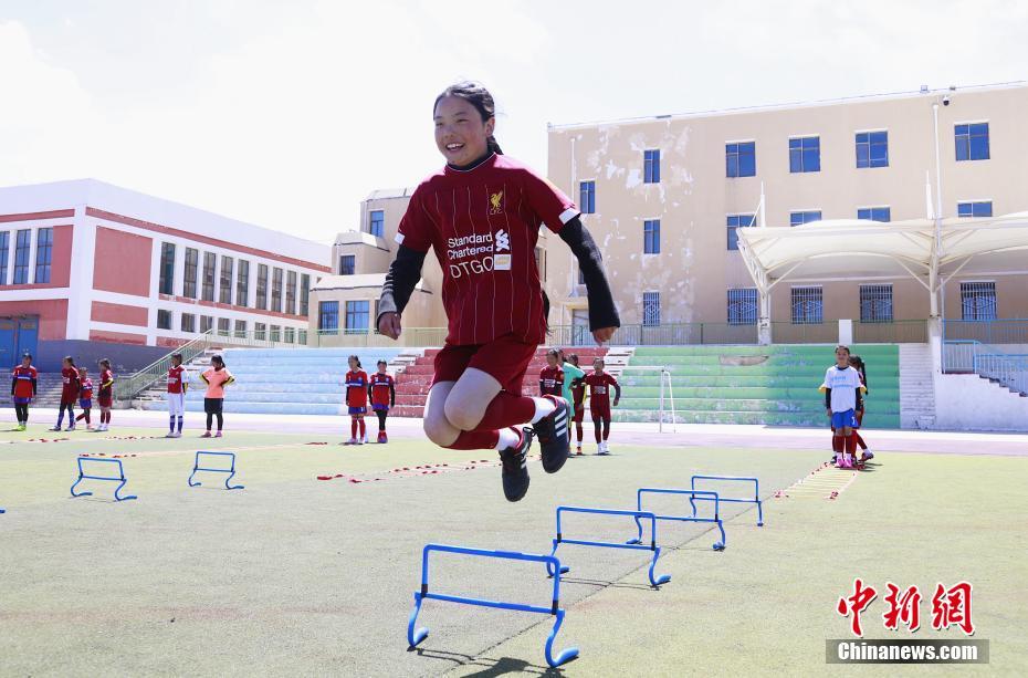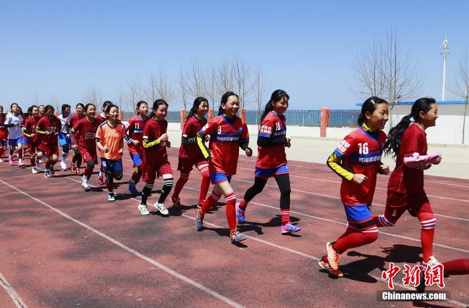 青海湖民族寄宿制學(xué)校的足球場上,女子足球隊的隊員們正在進行跑步熱身。中新社記者 馬銘言 攝