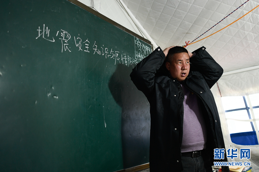 5月23日,李加才讓在九年級二班的主題班會上講解地震逃生知識。新華社記者 張龍 攝