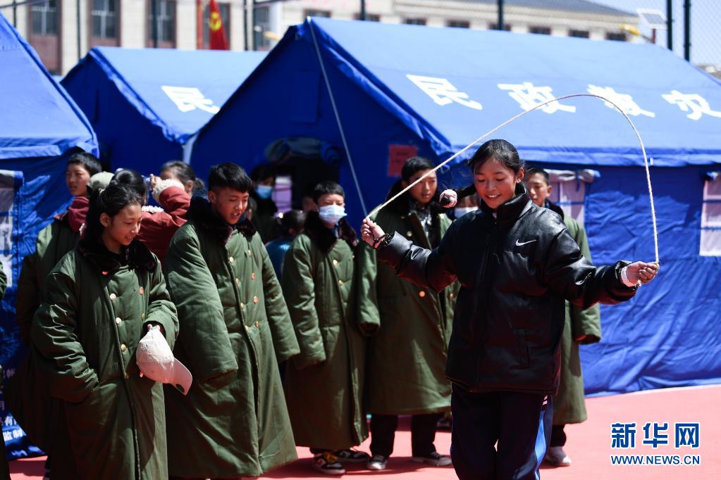 5月24日,曲邁卓瑪在課間與同學(xué)們一起跳繩。新華社 張龍 攝