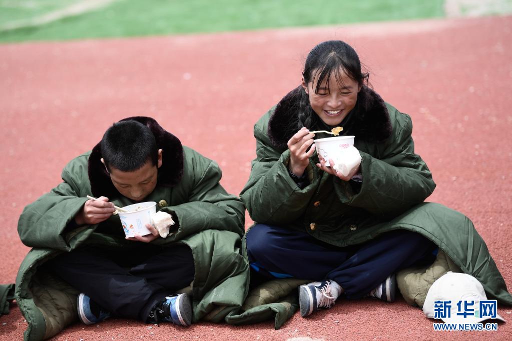5月24日,曲邁卓瑪(右)與同學(xué)在瑪多縣民族寄宿制中學(xué)吃午飯。新華社 張龍 攝
