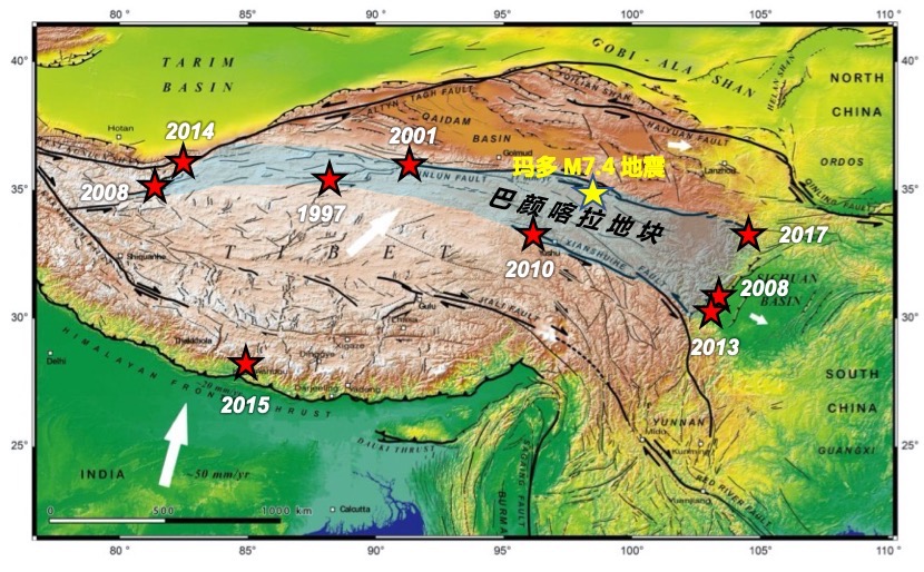 巴顏喀拉地塊地理位置及其周緣7級(jí)以上大地震分布。青海省科技廳供圖