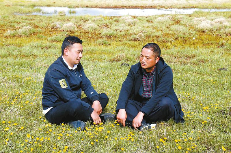 若爾蓋縣科學(xué)技術(shù)和農(nóng)業(yè)畜牧局局長張建榮(右)與牧民交流。四川日?qǐng)?bào)全媒體記者 徐登林 攝