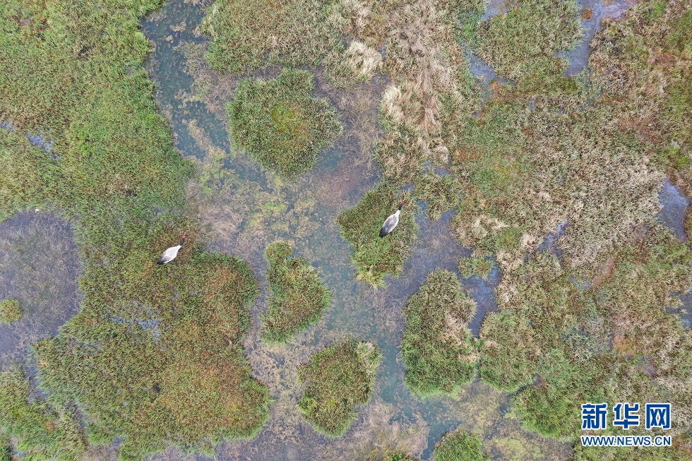 這是6月2日在甘肅省甘南藏族自治州碌曲縣尕海湖拍攝的國家一級保護動物黑頸鶴(無人機照片)。新華社記者 杜哲宇 攝