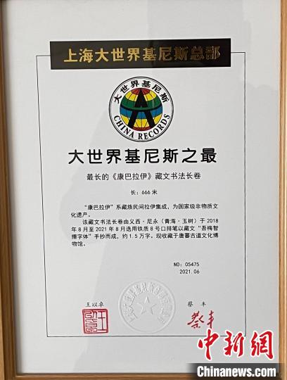 6月10日,青海省玉樹州治多縣唐蕃古道文化博物館發(fā)布信息稱,由該管收藏的國家級非物質(zhì)文化遺產(chǎn)——藏族民間文學(xué)手抄《康巴拉伊》最長藏文書法長卷,獲評“大世界基尼斯之最”(中國之最)。
