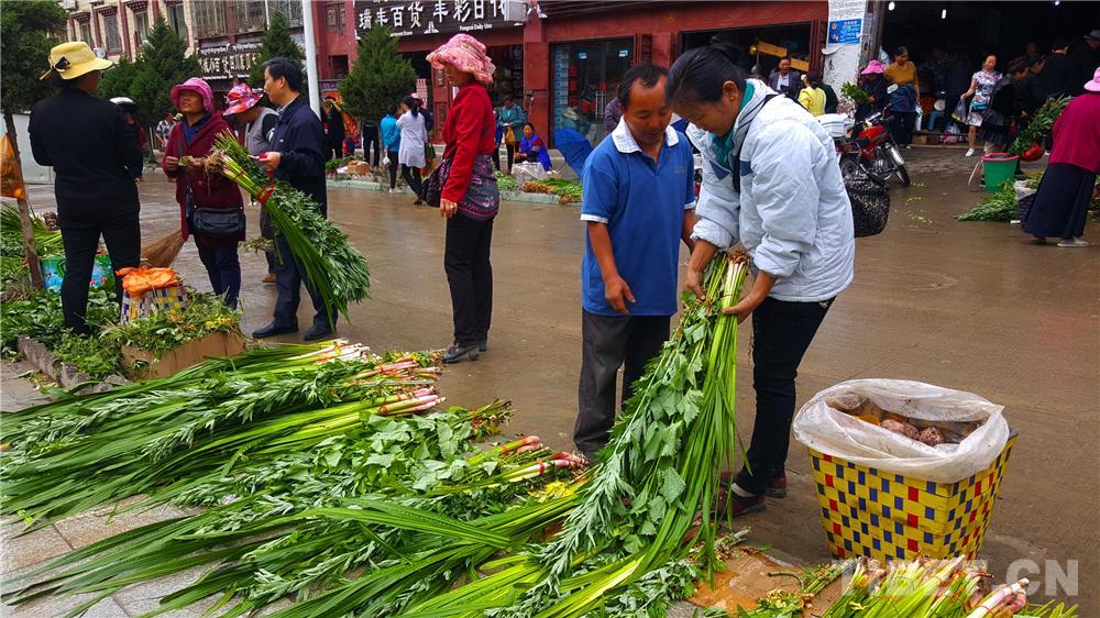 圖為藏族婦女懷抱剛買的菖蒲、艾葉