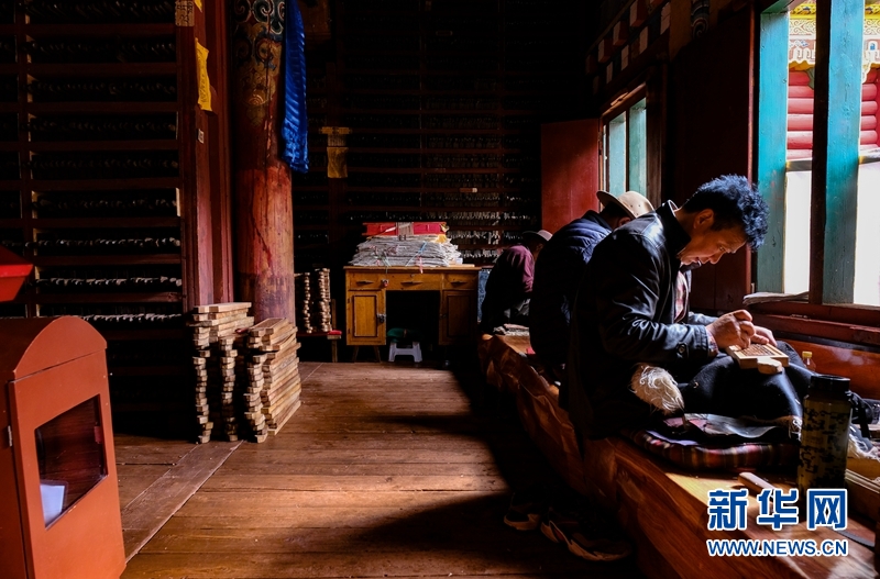藏族雕版印刷非遺傳承人在校對木刻版。新華網(wǎng) 張可凡 攝