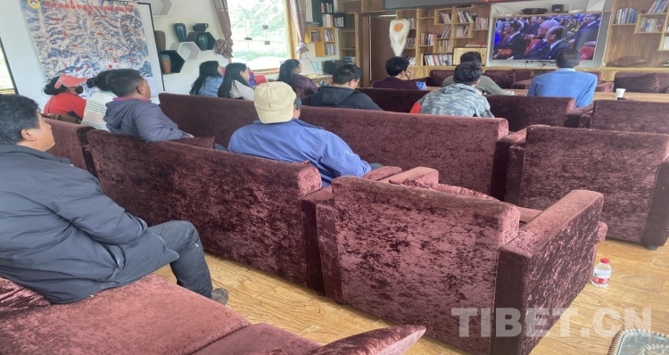 圖為四川甘孜甲洼鎮(zhèn)黨員一起觀看中國(guó)共產(chǎn)黨成立100周年大會(huì)直播