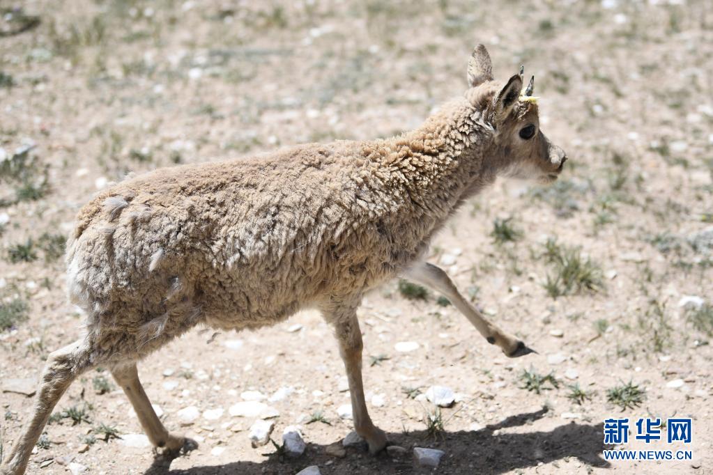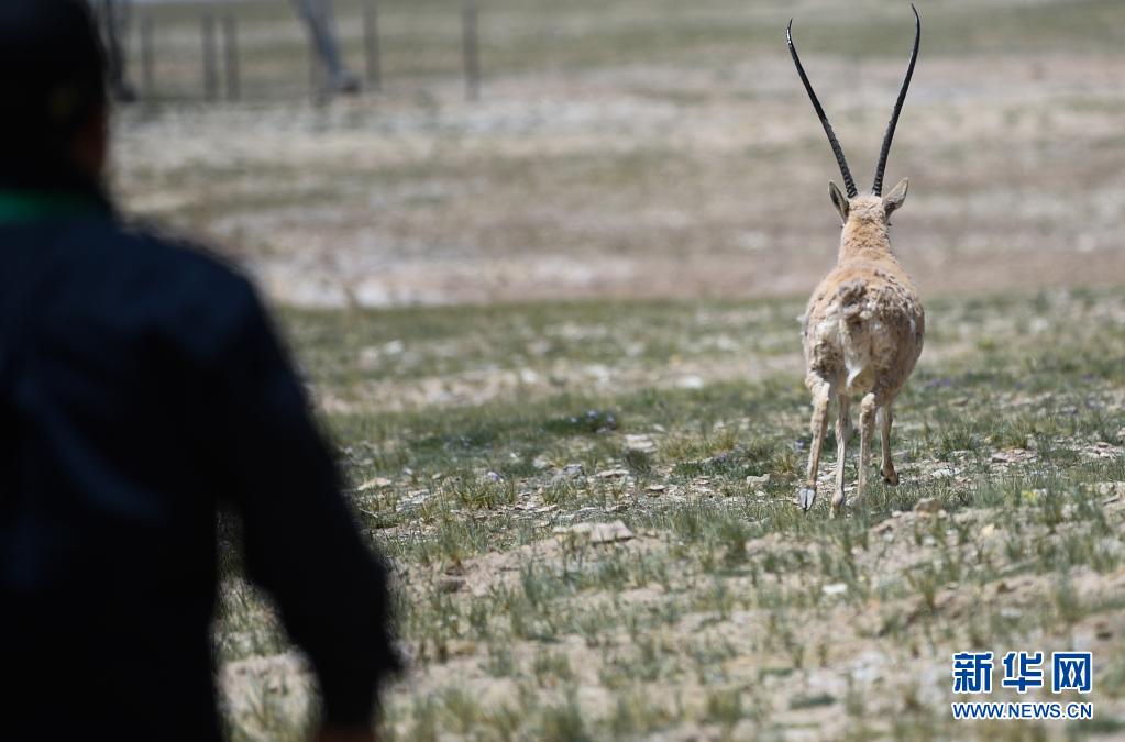 這是7月7日在可可西里索南達(dá)杰保護(hù)站野生動(dòng)物救助中心拍攝的一只被放歸自然的藏羚羊。新華社記者 張龍 攝