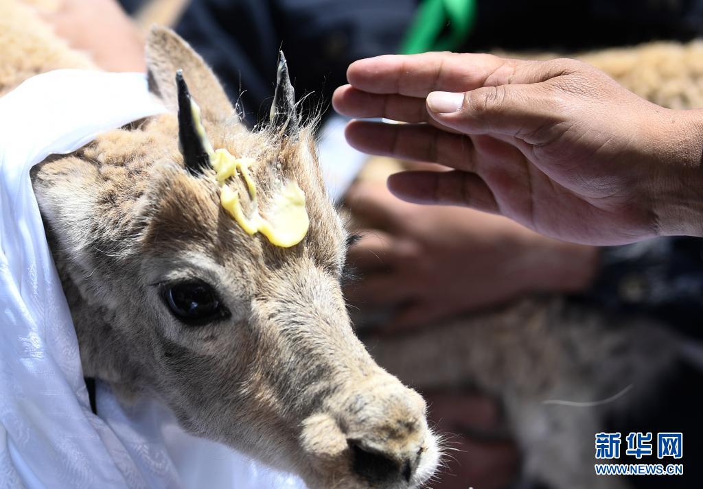 7月7日,在可可西里索南達(dá)杰保護(hù)站野生動(dòng)物救助中心,可可西里巡山隊(duì)員按照風(fēng)俗,在藏羚羊額頭上涂抹酥油表達(dá)祝福。新華社記者 張龍 攝