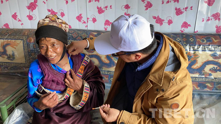49歲的拉毛羊措則是甲狀腺手術康復不久,她愛人已經(jīng)去世,和一兒一女及小外孫女一起生活,而女兒也患有肺結核。看到送來的藥物與生活用品,拉毛羊措一直用藏語說著“謝謝”,并豎起大拇指,臉上始終帶著發(fā)自內心的淳樸笑容。