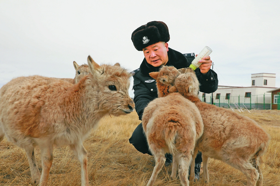 索南達(dá)杰保護(hù)站站長趙新錄在給藏羚羊幼仔喂奶。新華社發(fā)