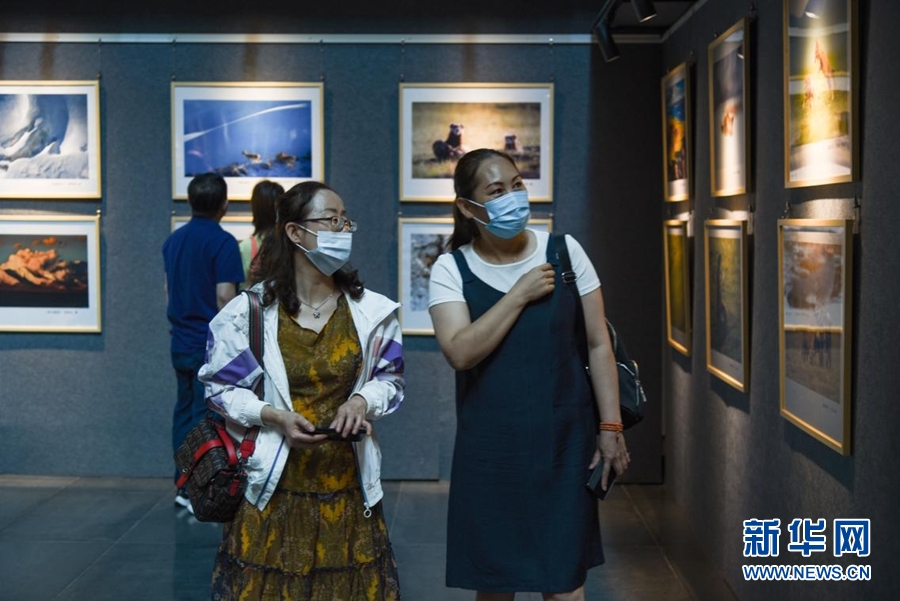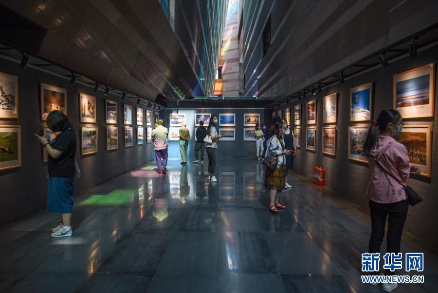 展覽現(xiàn)場(chǎng),觀(guān)眾正在觀(guān)賞影像祁連山系列作品。新華網(wǎng) 齊雨萌 攝
