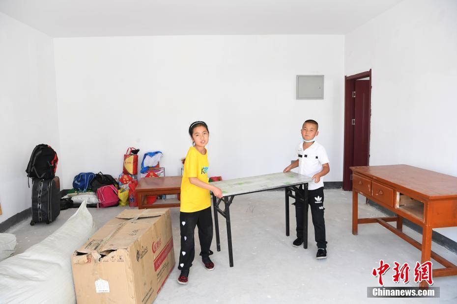 8月7日,甘肅省舟曲縣首批60戶289名地質災害避險搬遷村民到達蘭州新區(qū)并入住,11歲小女孩虎紅霞和弟弟在新家內整理家具。甘肅舟曲縣啟動地質災害避險搬遷工作,第一批次60戶289人集中告別故土,乘車前往數百公里之外的蘭州新區(qū)。 中新社記者 楊艷敏 攝