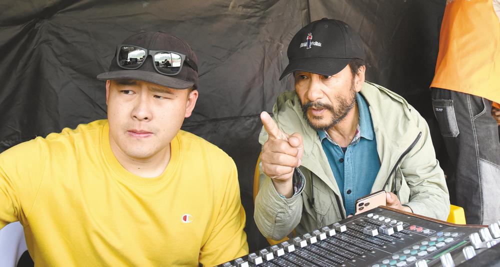 扎西多杰(右)在排練現(xiàn)場(chǎng)和演職人員交流。張多鈞 攝