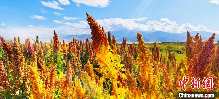 河西農(nóng)場農(nóng)民劉旦智種了30畝藜麥,紅色、白色、黑色的藜麥,在藍天白云的映襯下,勾勒出一幅高原秋收的美景圖?!敖衲贽见滈L勢不錯,一畝地大約600多斤,如果每斤按4塊錢算,一畝地可以收入3000多塊錢,經(jīng)濟效益很不錯。我還種了40多畝枸杞,長勢跟去年差不多,1斤能賣20多塊錢?!眲⒌┲歉吲d地給記者算著賬。