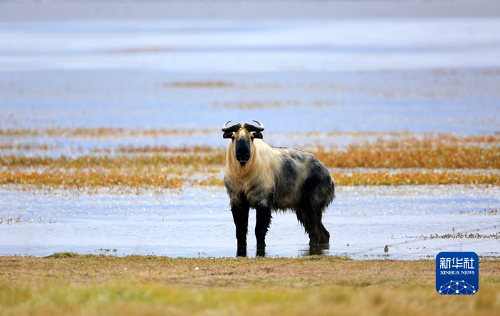 甘肅尕海則岔國家級(jí)自然保護(hù)區(qū)管理局尕海保護(hù)站工作人員在尕海湖畔拍攝到一頭羚牛。新華社 張勇 攝