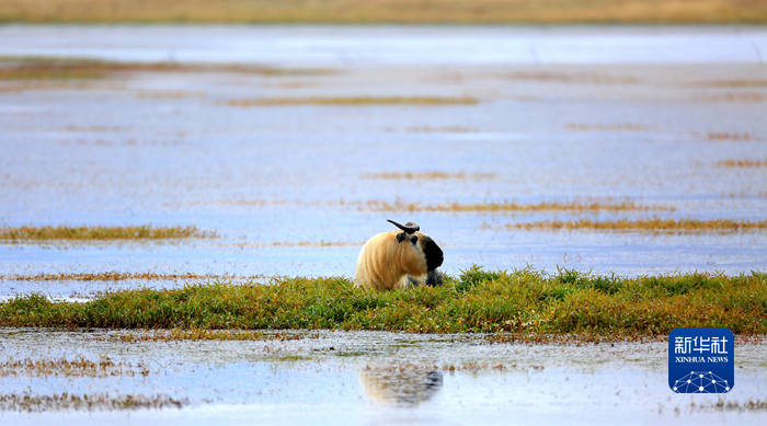 出現(xiàn)在尕海湖畔的羚牛。新華社 張勇 攝