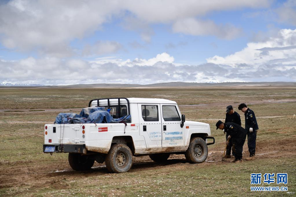 在前往可可西里卓乃湖保護(hù)站途中,巡山隊員將車輛移出泥坑(2020年7月6日攝)。新華社 張龍 攝