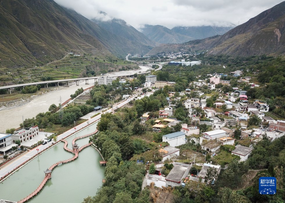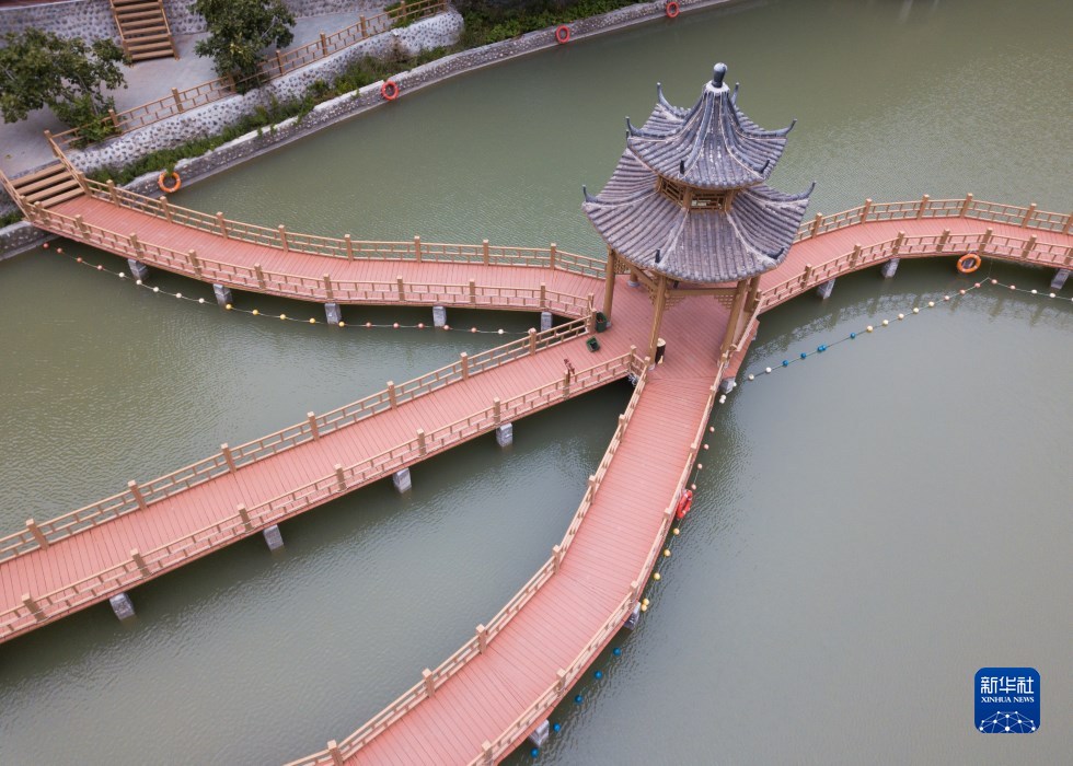 這是10月13日在舟曲縣大川鎮(zhèn)土橋子村拍攝的田園觀光體里的水上步道(無人機(jī)照片)。新華社記者 馬希平 攝