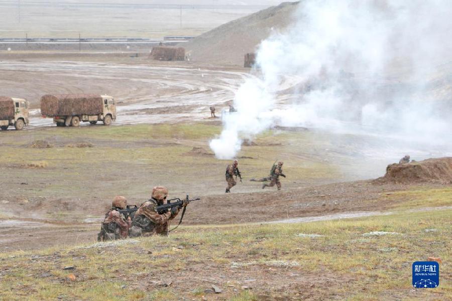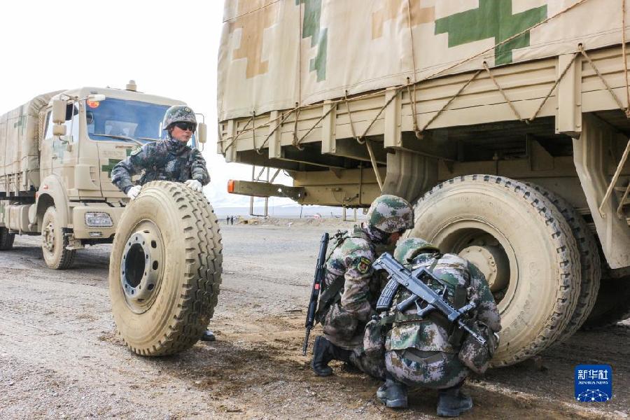 聯(lián)勤保障部隊汽車運輸某團一營一連參加高原駐訓(xùn)時,在行車途中組織官兵進行防衛(wèi)演練(2020年6月16日攝)。新華社發(fā)