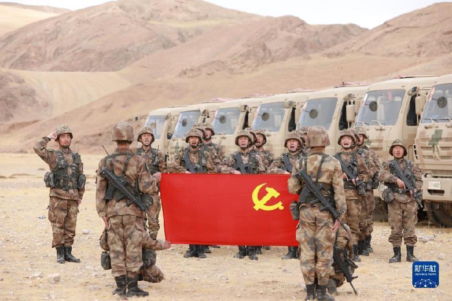 聯(lián)勤保障部隊汽車運輸某團一營一連在高原執(zhí)行運輸任務(wù)時,利用休息間隙組織官兵重溫入黨誓詞(5月10日攝)。新華社發(fā)
