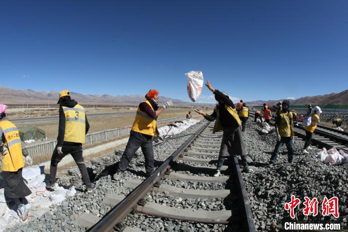 藍(lán)天白云,風(fēng)和日麗,念青唐古拉山腳下,一群“天路保健醫(yī)生”身穿工裝、手持器械、翹首以待準(zhǔn)備為道床“洗澡修腳”。