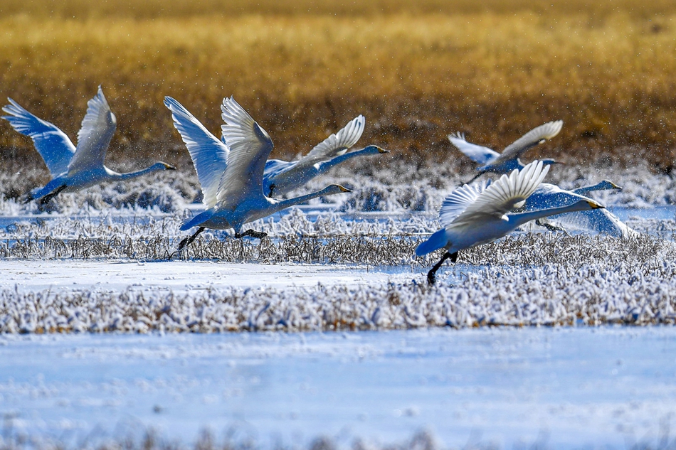 入冬以來,甘肅省甘南藏族自治州碌曲縣尕海濕地越冬的大天鵝浴雪歡歌,翩翩起舞,成為草原上一道獨特的風(fēng)景。