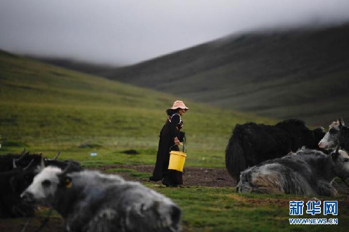 2021年8月3日,在果洛州瑪沁縣當洛鄉(xiāng)貢龍村的夏季草場上,牧民準備擠牛奶。新華社記者 張龍 攝