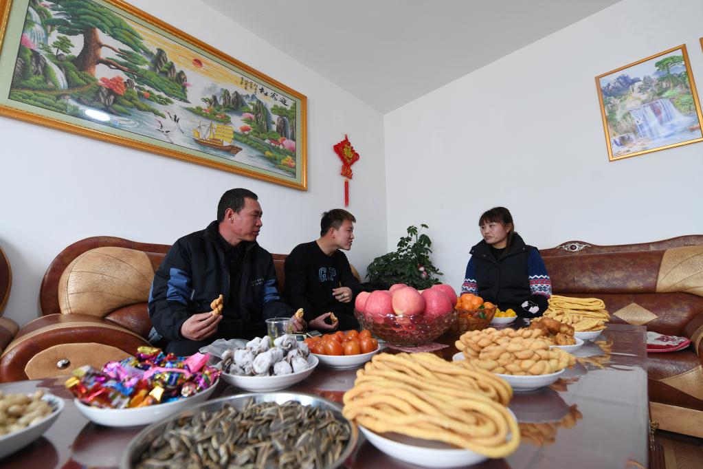 1月25日,在蘭州新區(qū)舟曲避險搬遷安置點,劉長海(左)、寧蘭玉(右)和孩子一起在家中吃飯。新華社記者 范培珅 攝