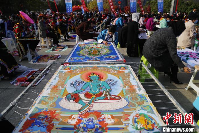 圖為藏族繡娘繡制唐卡。(資料圖) 馬銘言 攝