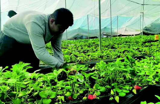 走進(jìn)種植園,一派熱火朝天的工作景象。種植員疏花疏果,設(shè)施工人爬上塑料薄膜大棚進(jìn)行日常監(jiān)測維修……所有工作都在有條不紊地進(jìn)行,為優(yōu)質(zhì)草莓生長提供保障。