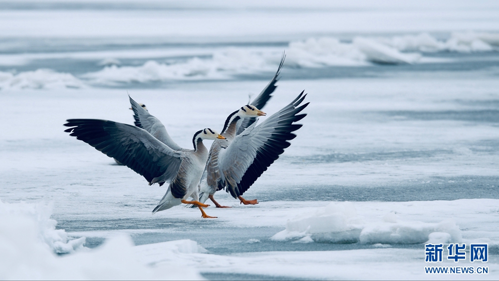 兩只斑頭雁在未解凍的青海湖面上嬉戲。新華網(wǎng) 潘彬彬 攝
